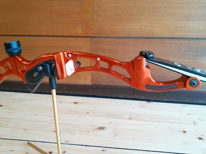 ・弓本体の中心でグリップ(持つ部分)がある ・剛性が高い ・矢を通すためのウインドウ部がある (トルクフライトコンペンセイタ―や重りはこの部分に付ける) ・付属品を全部取り付けた状態で弦を張らない弓は、内径12.2cm±0.5mmの穴またはリングを通り抜けなければならない |